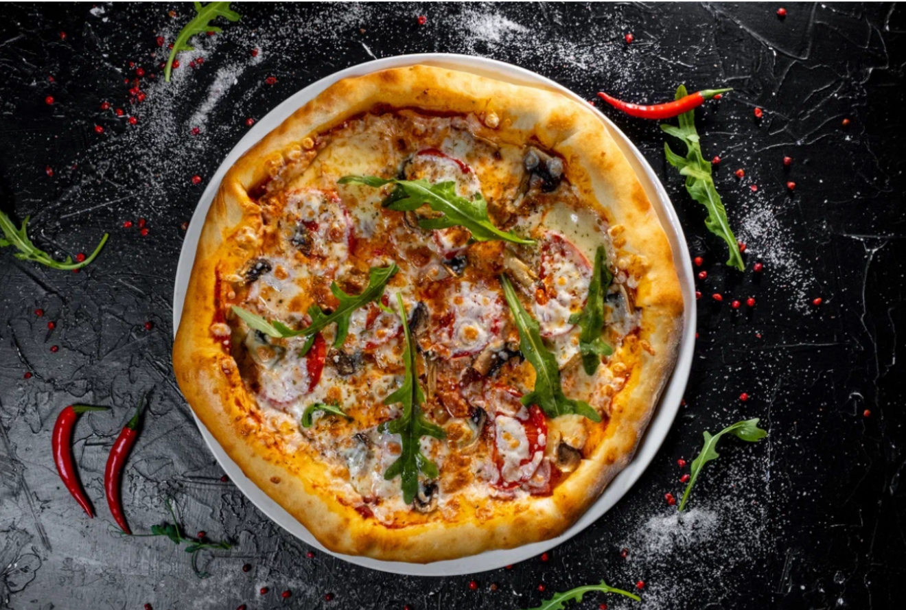 ТОНКОЕ ТЕСТО, БЕКОН, ШАМПИНЬОНЫ, СВЕЖИЙ ТОМАТ, СЫР МОЦАРЕЛЛА, СЫР ГАУДА, ТОМАТНЫЙ СОУС, РУККОЛА. СЫРНЫЕ БОРТЫ.