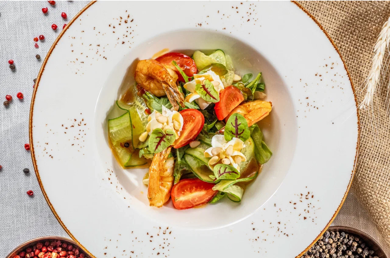 Микс салата, руккола, тигровые креветки, свежий огурец, томаты черри, ореховый соус, творожный сыр и устрично-масляная заправка.